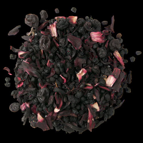 Ingredients: Elderberries + Currants (a.k.a. Corinthian raisins), Hibiscus petals, Natural flavors (organic compliant) (Decaf)