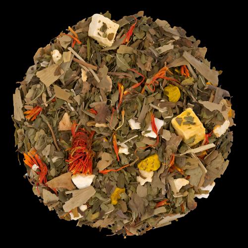 Ingredients: Peppermint, Ginkgo leaves, Orange + Turmeric + Pumpkin pieces, Safflower petals. (Decaf)
