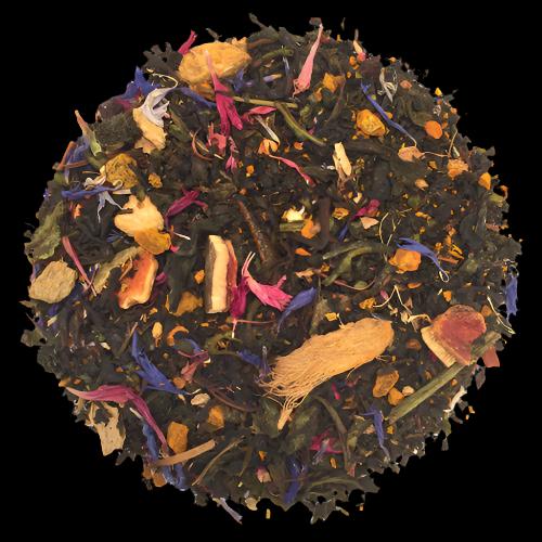 Ingredients: Green tea, Black tea, Turmeric, Ginger, Bael Nut, Cornflower petals, Natural flavors (organic compliant).