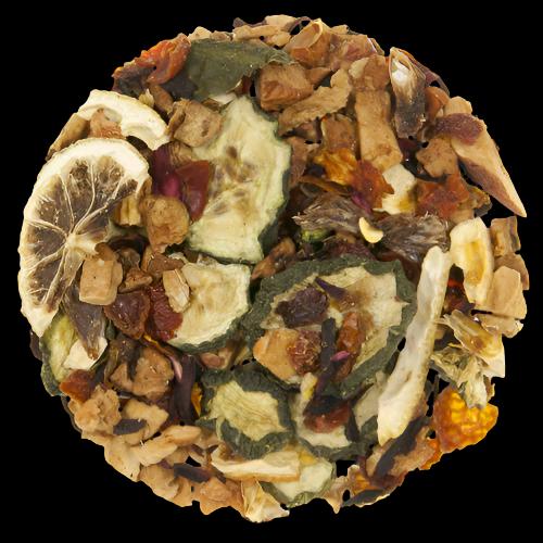 Ingredients: Apple + Hibiscus + Rosehip pieces, Cucumber + Lemon + Lime + Orange slices, Tomato pieces, Natural flavors(organic compliant) (Decaf)