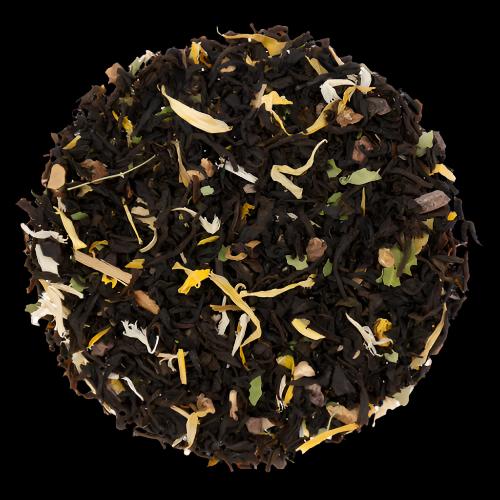 Ingredients: Black tea, Carob pieces, Cocoa Beans, Sarsaparilla Root, Moringa, Calendula + Cornflower + Marigold + Sunflower petals, Natural flavors (organic compliant).